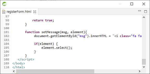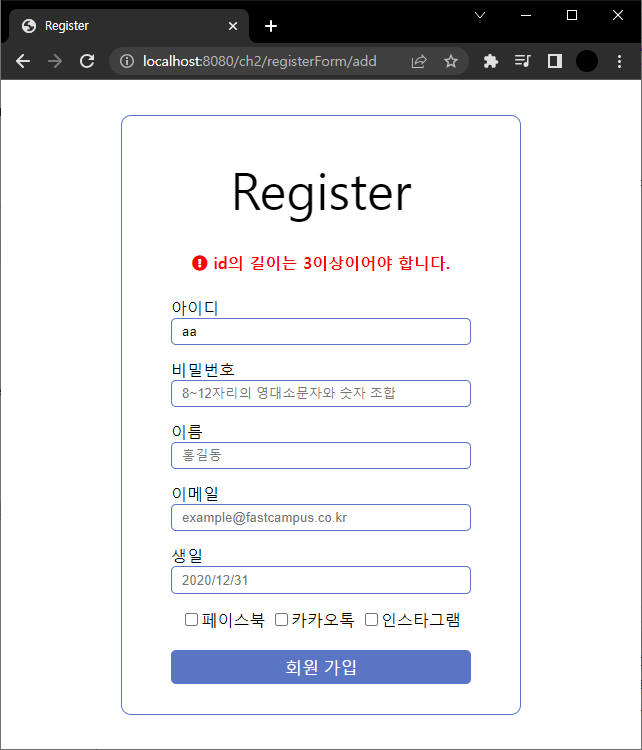 registerForm.html 코드를 보면 formCheck로 id가 입력되지 않았을 때 에러가 발생한는 코드가 있다. if에서 id의 길이를 확인하고 참이면 return true;를 반환한다. if문을 id, pwd 등 추가해서 폼 입력이 정확한지 확인할 수 있다.