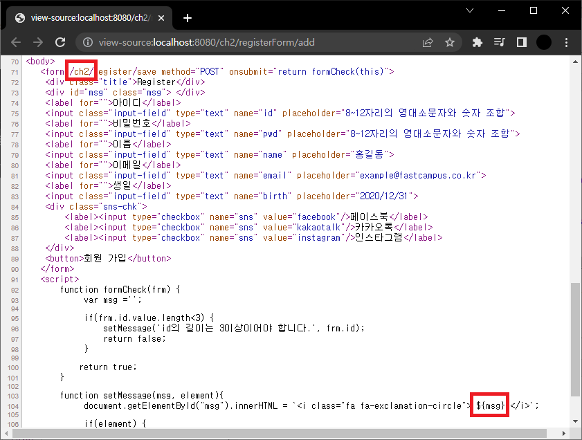새로 고침하고 소스 보기를 누르면 context root가 자동 추가되고 ${msg}가 없어지지 않는 것을 확인할 수 있다.