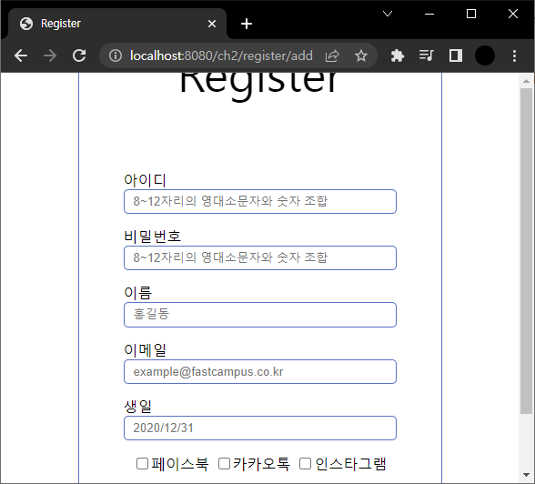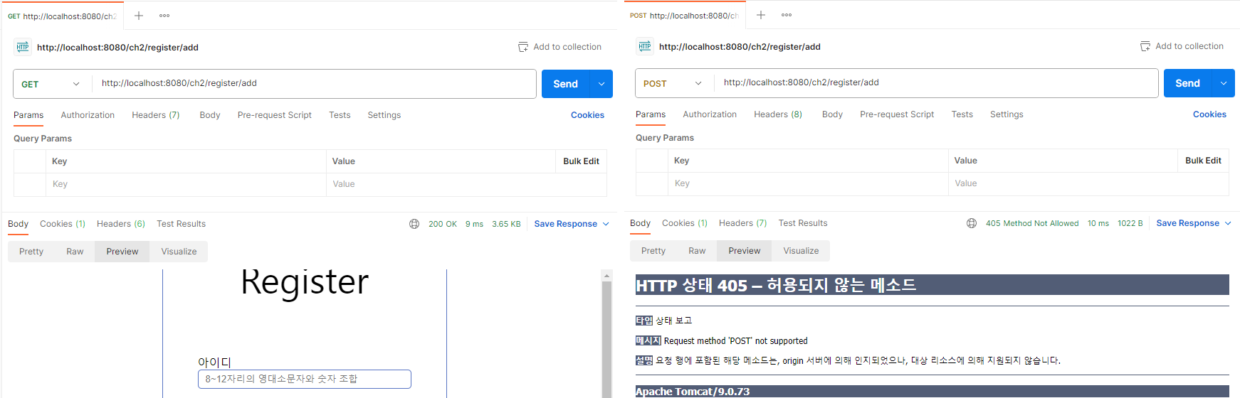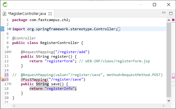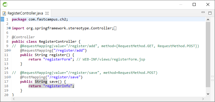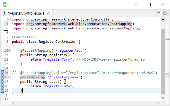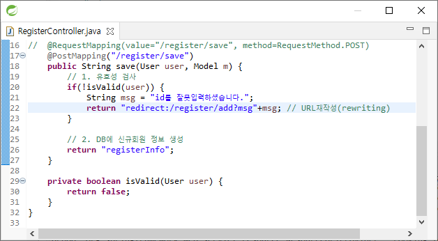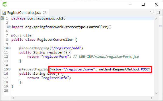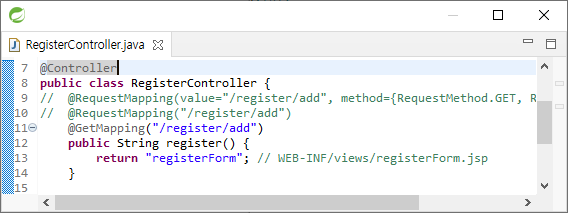 @RequestMapping("/register/add")을 @RequestMapping(value="/register/add", method={RequestMethod.GET, RequestMethod.POST})와 같이 쓸 수 있다. 둘은 같은 문장이고 method를 통해 GET, POST 요청을 결정할 수 있다.