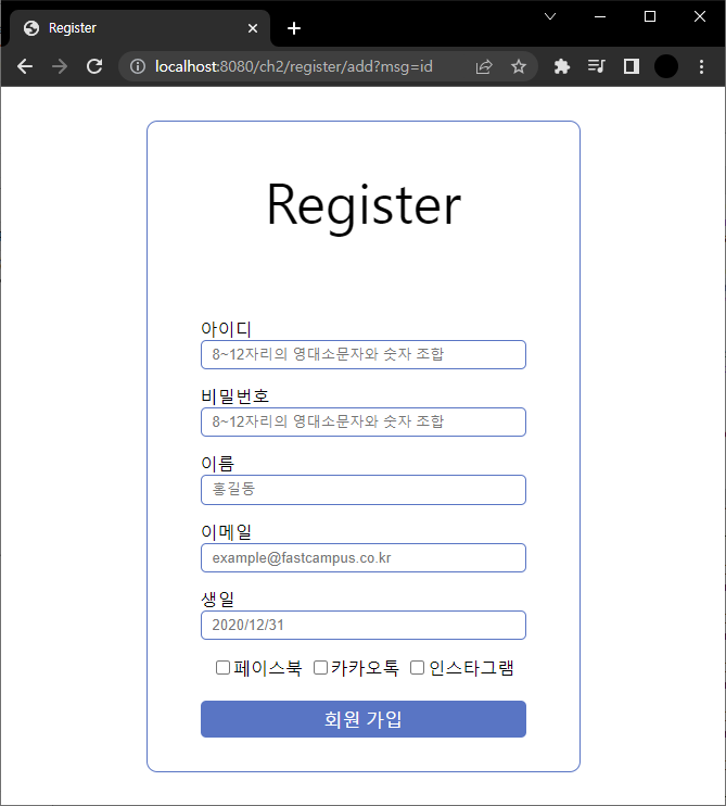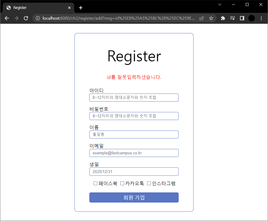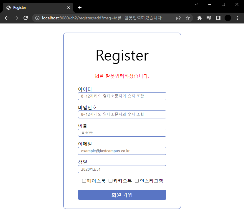 "id를 잘못입력하셨습니다." 한글 넣으면 에러 발생해서 msg에 id만 넣고 입력했다. isValid가 false이므로 save로 넘어가지 않는다.
