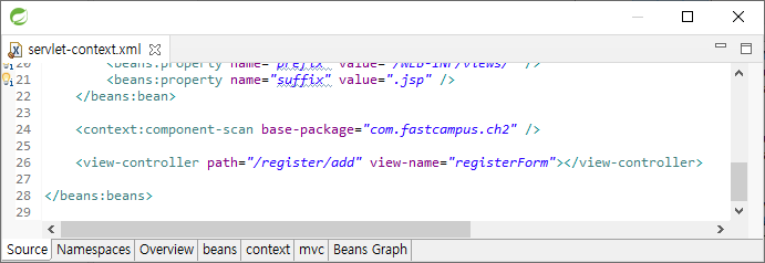 위 한 줄을 추가한다. path의 경로를 view-name의 jsp파일에 연결한다.
