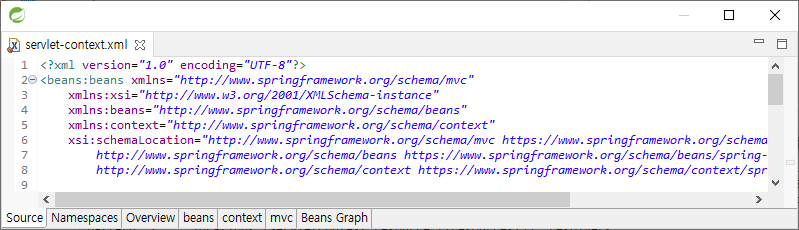 servlet-context에 beans 태그가 쓰는 xmlns이 4개가 있다. 각 schema에서 정의한 태그를 이용하기 위해 사용한다.