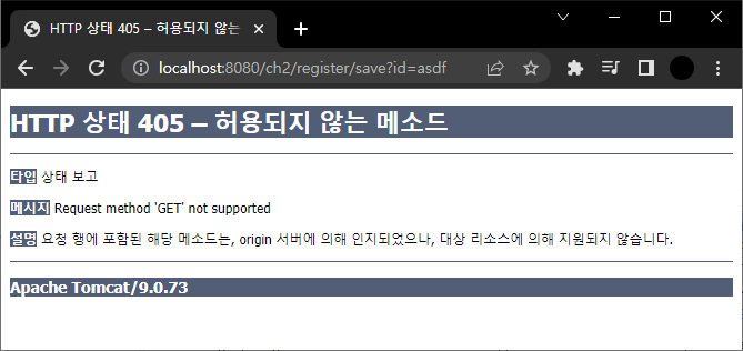 입력을 POST로 설정했지만 위처럼 URL에 직접 입력해서 회원가입을 할 수 있다. 이렇게 되면 회원가입을 자동으로 할 수 있는 위험이 있어서 GET요청을 막아야한다.