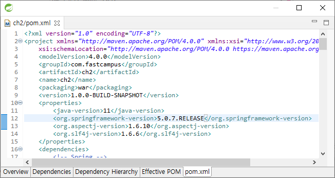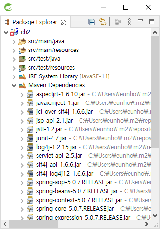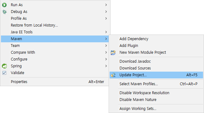 pom.xml의 org.springframework-version을 5.0.7로 바꾼다. 바꾼 후에 Maven 업데이트를 해야 한다.