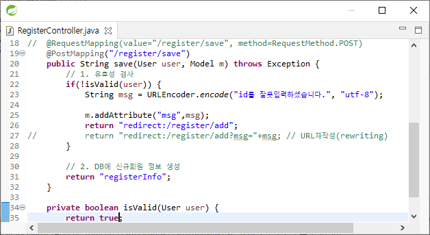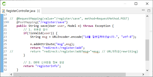 전달할 값이 많을 때 return이 길어져 msg를 Model에 담아서 위와 같이 2문장으로 나눌 수 있다. redirect를 쓸 경우 register/add 페이지로 넘어가기 때문에 save에 있는 Model를 사용할 수 없지 않을까 하는 의문이 있다. 이를 sprinig이 자동으로 붙여줘서 위 처럼 2문장으로 나눌 수 있다.