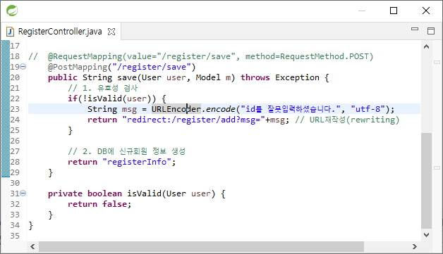 msg가 출력되지 않을 경우 URLDecoder를 사용한다. URLDecoder는 java.net에 있는 것이라 import문을 써줘야 한다.