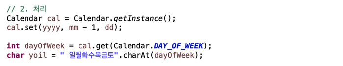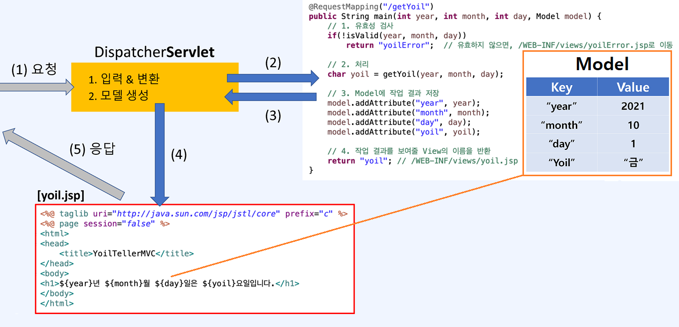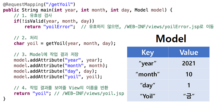 Controller가 입력받은 날짜로 yoil을 계산한다. 이 결과는 Model 객체에 key, value 형태로 담아진다.