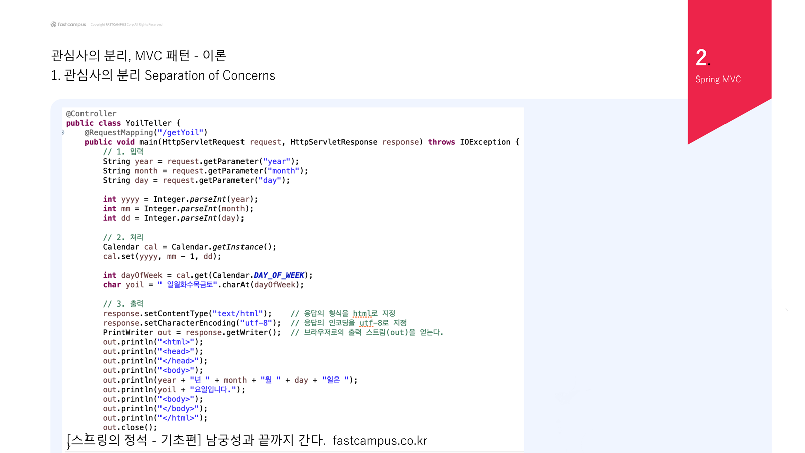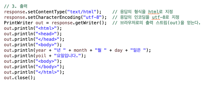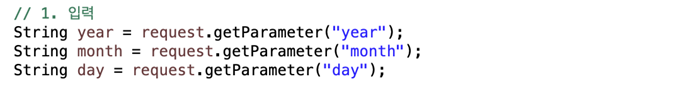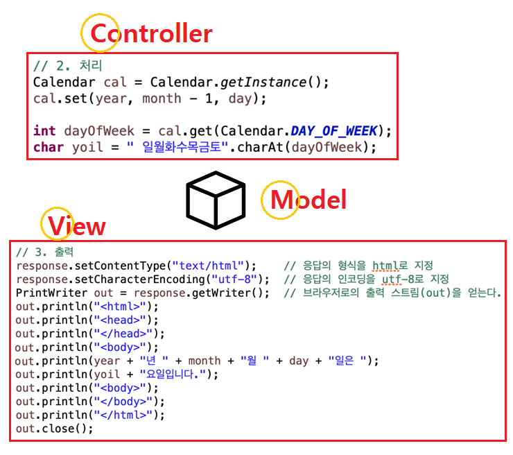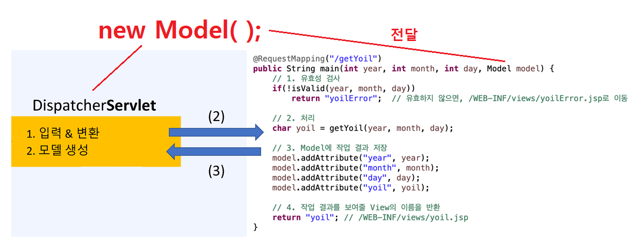 "처리", "출력" Concern이 메서드 안에 같이 있기 때문에 year, month, day, yoil은 바로 접근할 수 있다. 하지만 분리되었을 때는 서로 다른 영역으로 접근하지 못한다. 따라서 이 중간을 이을 객체가 필요하다. 이 객체를 Model 객체라 하고 결과를 출력할 때 필요한 값을 Model 객체에 저장한다. Model 객체를 출력하는 곳에 전달해 원하는 정보를 출력 가능하게 만든다.