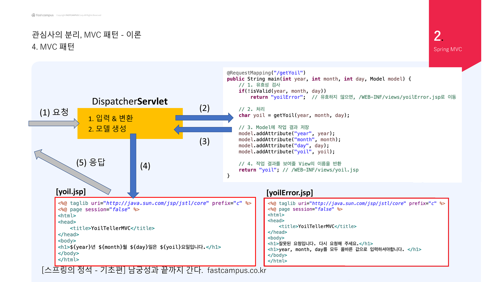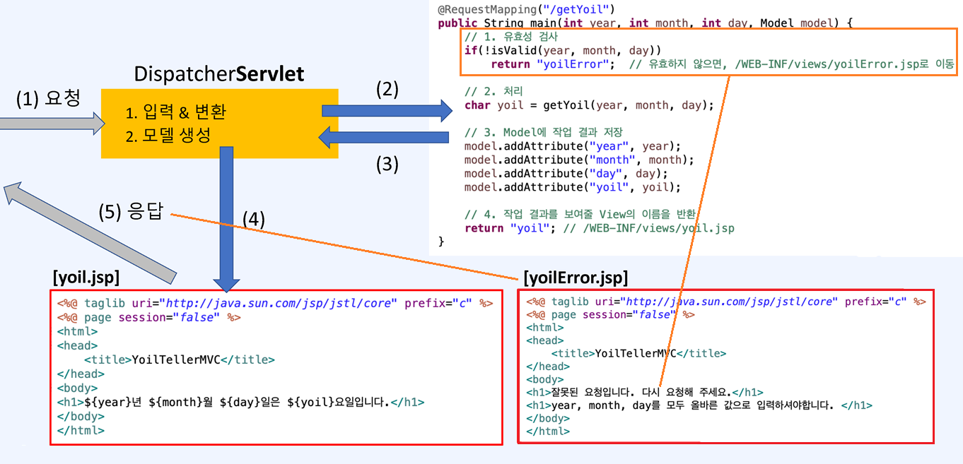 yoil이 유효하지 않으면 return "yoilError"을 반환해서 yoilError.jsp가 클라이언트에게 응답을 전달하다. 이때, Model은 필요하지 않다. yoil.jsp, yoilError.jsp가 View인데 View를 Controller에서 분리하니 상황에 따라서 보여줄 것을 다르게 할 수 있다.