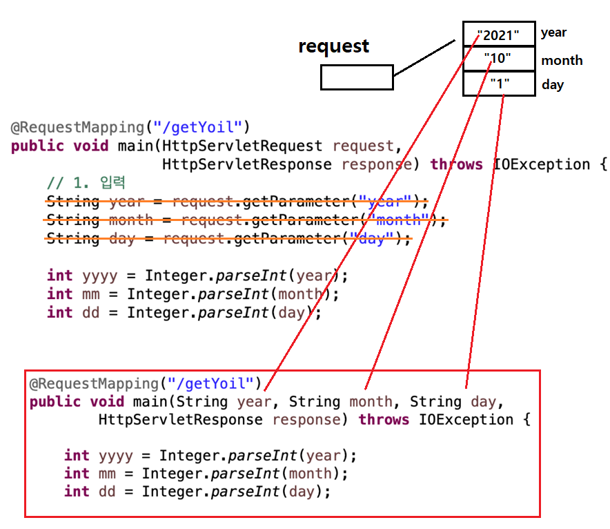 main 메서드의 매개변수를 HttpServletRequest 객체로 받고 getParameter 메서드를 사용해서 꺼내와 썼다. 입력 Concern을 분리하면 request 객체로 받지 않고 개별 매개변수로 직접 받도록 바꿀 수 있다. 차이점은 request 객체 전체를 받아서 썼는데 개별적으로 받을 수 있다. 이렇게 되면 getParameter 메서드를 사용하지 않아도 된다.