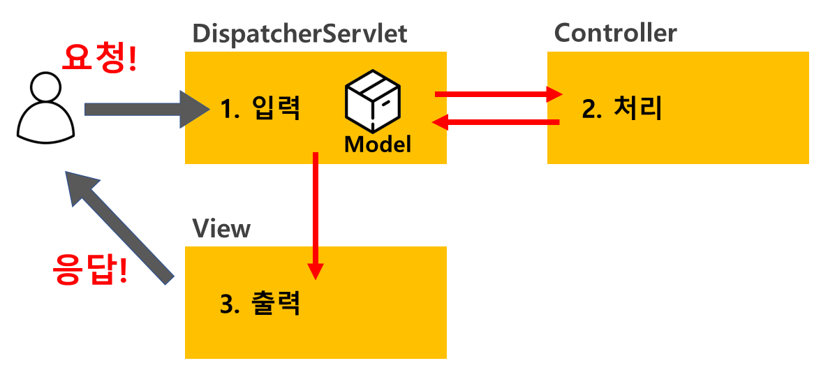 Spring MVC에서는 사용자의 request가 들어오면 DispatcherServlet에서 입력을 처리한다. DispatcherServlet에서 입력을 처리하고 요청을 Controller에 전달한다. Controller가 처리하고 되돌려준 다음 출력에 전달한다. 이때, 입력을 처리하고 Model 객체를 Controller에게 전달하면 처리한 결과를 Model에 저장한다. DiapatchServlet이 작업결과가 담긴 Model을 View에게 전달한다. 이 작업 결과를 응답으로 만들어 클라이언트에게 전달한다.