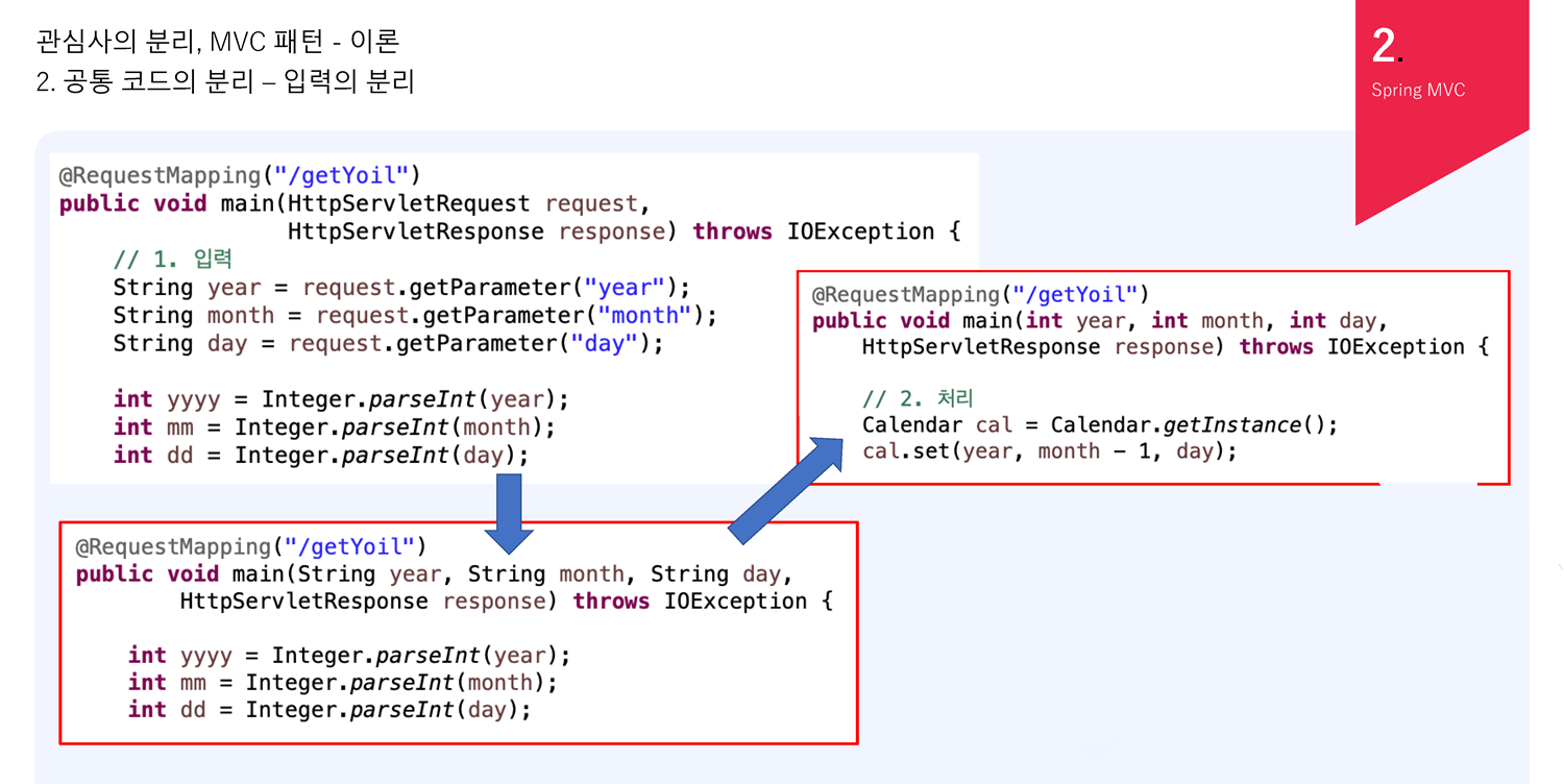 심지어는 변수에 String이 아니라 int를 쓸 수 있다. Spring이 문자열을 정수로 자동 형변환 해준다. "abc"은 자동변환되지 않지만 숫자는 자동 형변환해서 쓸 수 있다. 메서드의 선언부를 위와 같이 사용하면 입력 부분 전체가 필요 없다. 공통 코드 중 입력을 분리해서 3개의 Concern 중에 1개가 없어졌다.