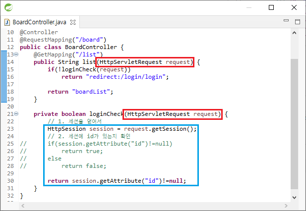 LoginController에서 id를 세션에 저장하면 로그인하고 Board 게시판에 접근할 수 있다.