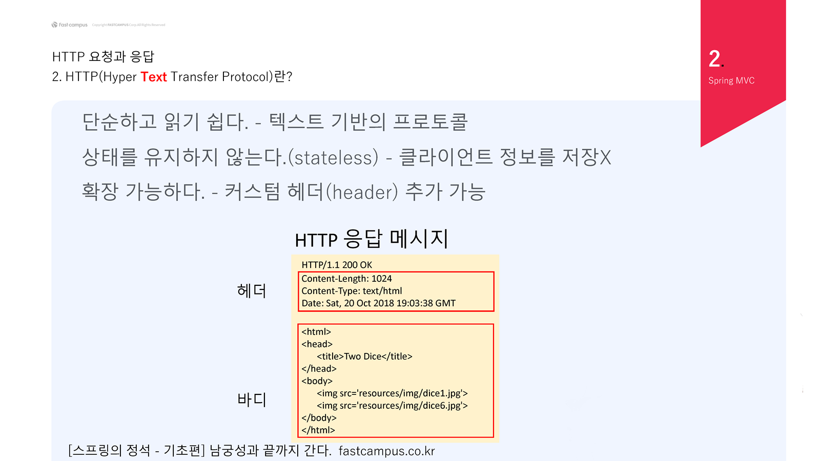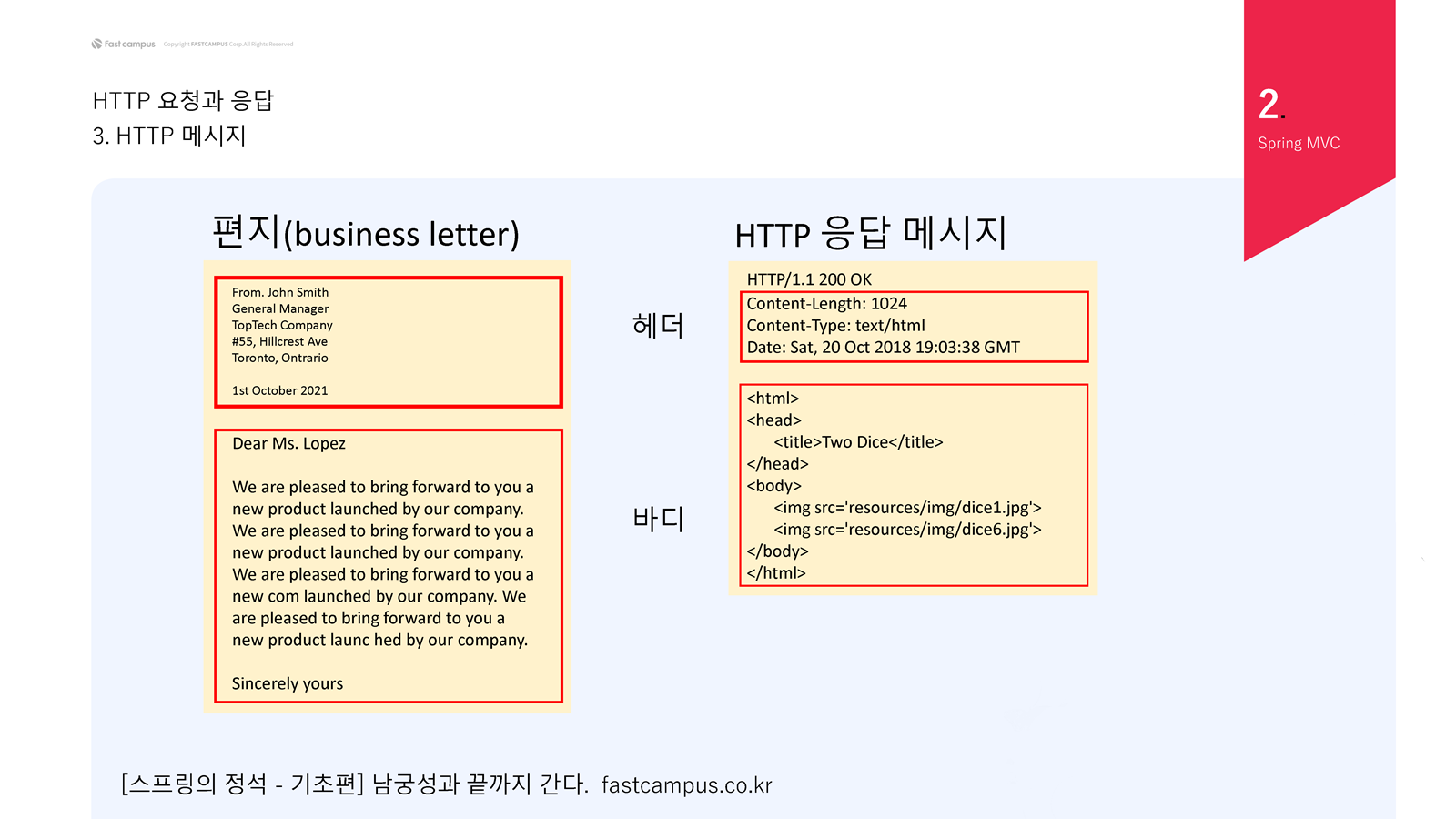 HTTP 응답 메시지는 business letter와 같다. 첫 번째, text기반이고 두 번째, 메시지의 정보가 담긴 헤더가 나오고 다음에 내용인 바디가 나온다.