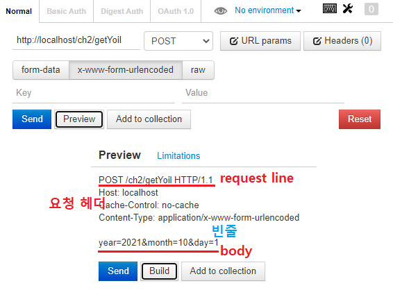 POST 요청은 year=2021&month=10&day=1 data가 url이 아니라 바디에 들어간다.