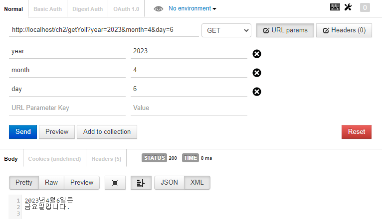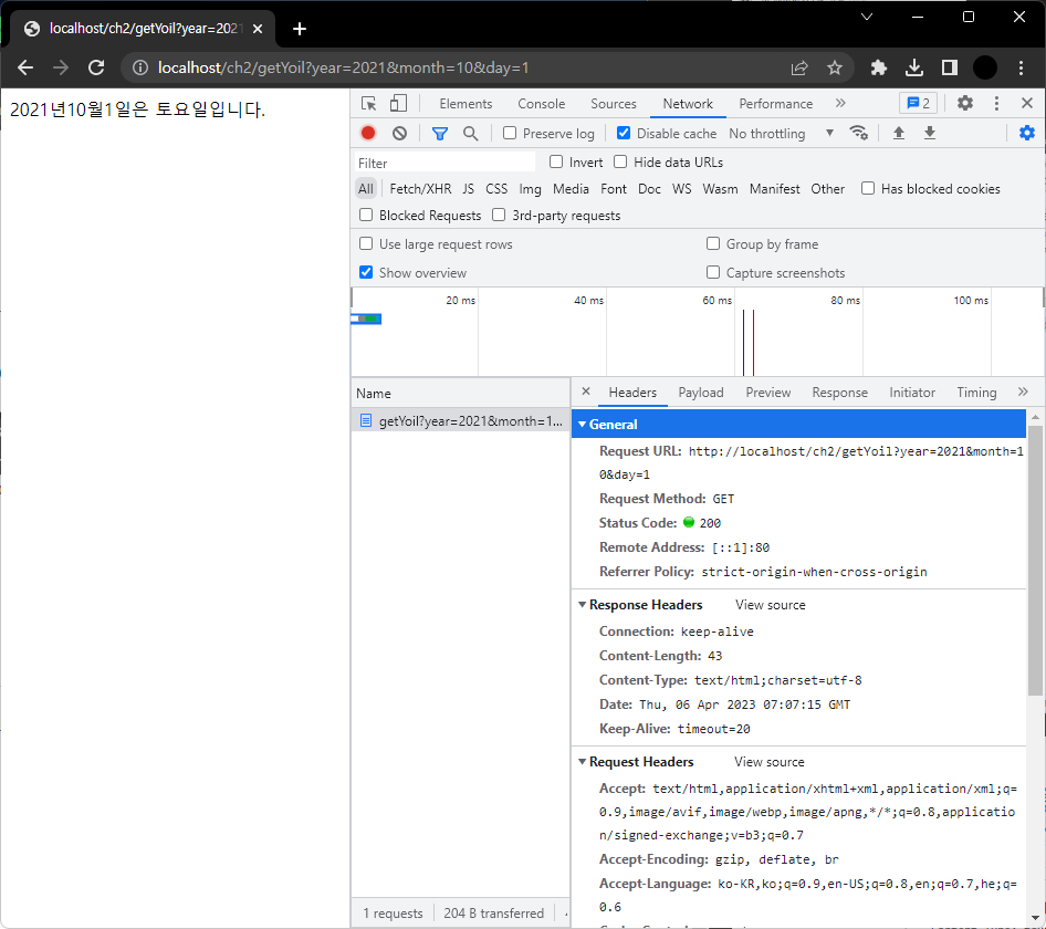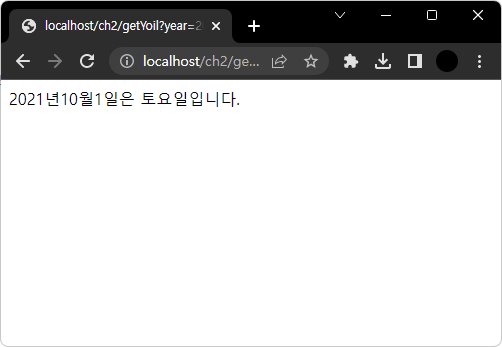 "http://localhost/ch2/getYoil? year=2021&month=10&day=1"입력하고, 브라우저 창에서 우클릭하고 검사를 클릭한다.