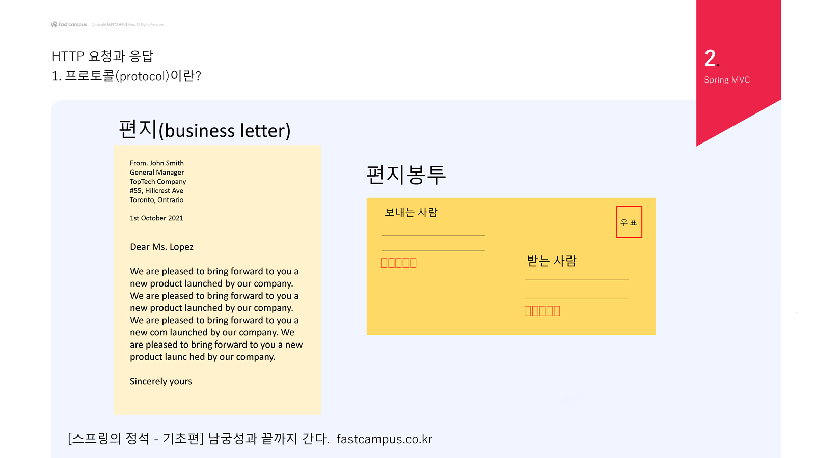 protocol은 '주고받을 데이터에 대한 형식을 정의한 문서'이다. 이는 business letter와 비슷하다. business letter 맨 위에는 받는 사람, 직책, 주소, 날짜 등 꼭 써야 할 내용이 있다. 편지봉투에는 보내는 사람이 왼쪽 위에, 받는 사람이 오른쪽 아래에 작성돼야 하는데 이 형식, 규칙, 약속이 protocol이다. 이런 합의가 있기 때문에 주고받을 때 별 탈이 없다.
