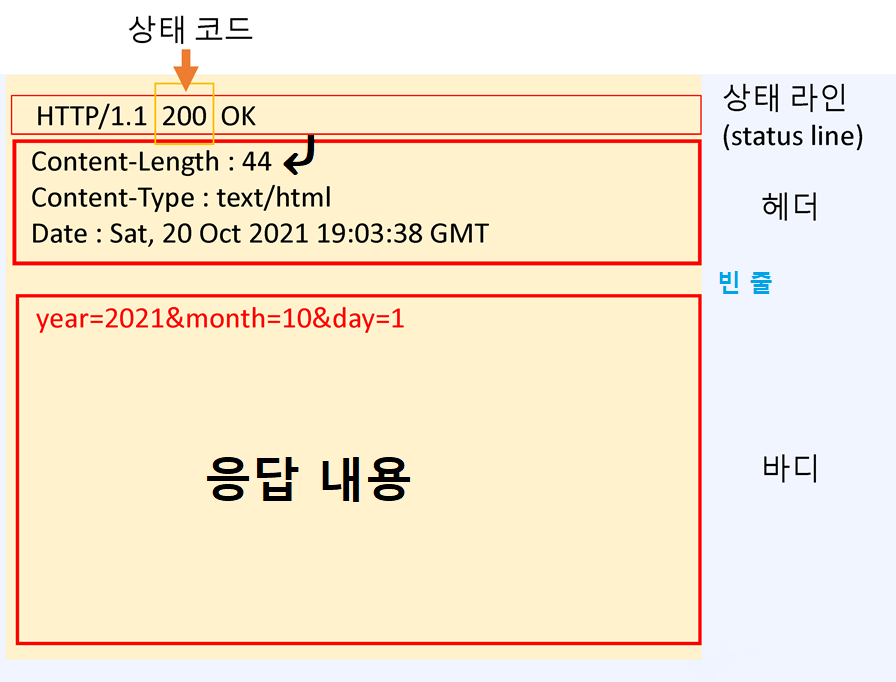 헤더와 바디에는 빈 줄 하나가 있다. 헤더영역에 헤더는 한 줄이 아니라 N줄이고 각 line은 줄바꿈이 되어 있다. 헤더는 'header-text + ⤶(줄 바꿈 문자열)'이 하나의 단위이다. 헤더가 몇 line일지 모르기 때문에 빈 줄을 둬서 헤더와 바디를 구분한다. 바디에는 응답 내용이 온다. status line, 헤더, 바디를 합쳐서 Sever가 Client에게 전달하는 응답 메세지를 구성한다.