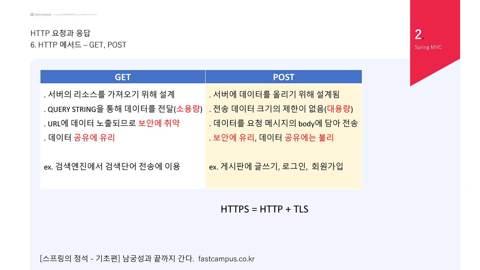 POST는 상대적으로 보안에 유리하고 data 공유는 불리하다. 상대적으로 보안에 유리하다는 말은 POST로 전송했다고 보안에 절대적으로 안전하다는 말이 아니다. HTTP에 TLS Protocol을 적용하면 https:// 가 만들어진다. TLS는 암호화 Protocol이다. TLS는 SSL에서 발전한 모델이다. 아무튼 TLS없이 POST 방식을 사용하면 보안에 취약하다.