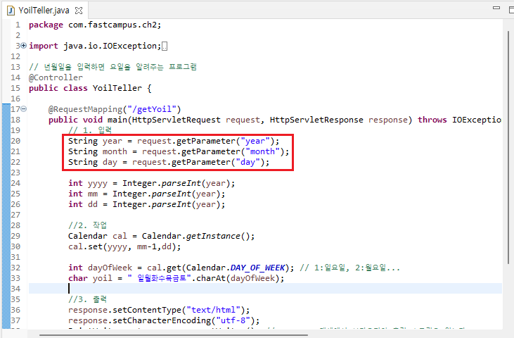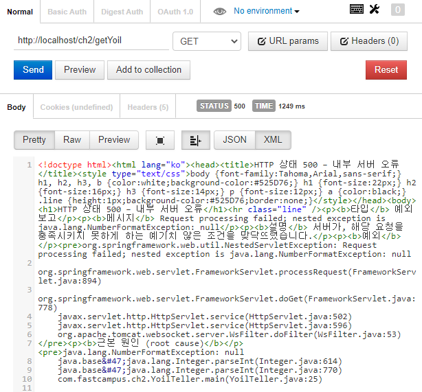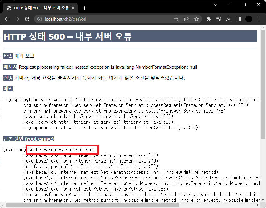 URL에 localhost/ch2/getYoil을 입력했을 때, 500번 Error가 발생한다. NumberFormatException예외가 발생했는데 처리하지 못해서 발생한 Error이다.