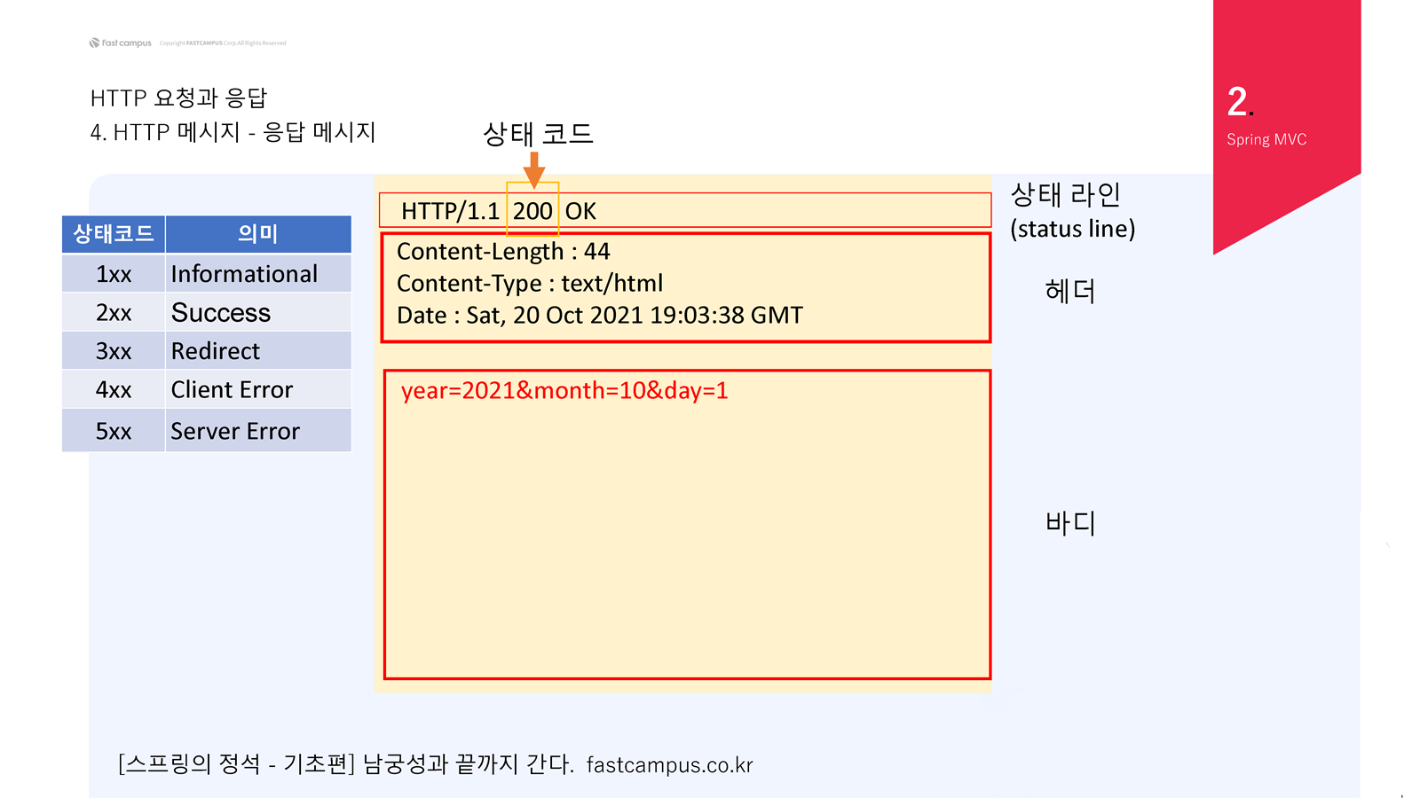 응답 메시지의 첫번 째 줄은 status line으로 요청이 어떻게 처리되었는지 알려준다. 번호 '200'은 상태 코드, 'OK'는 상태 코드의 설명이다. HTTP/1.1 protocol로 통신을 했고 요청에 대한 결과가 코드 '200'이다.