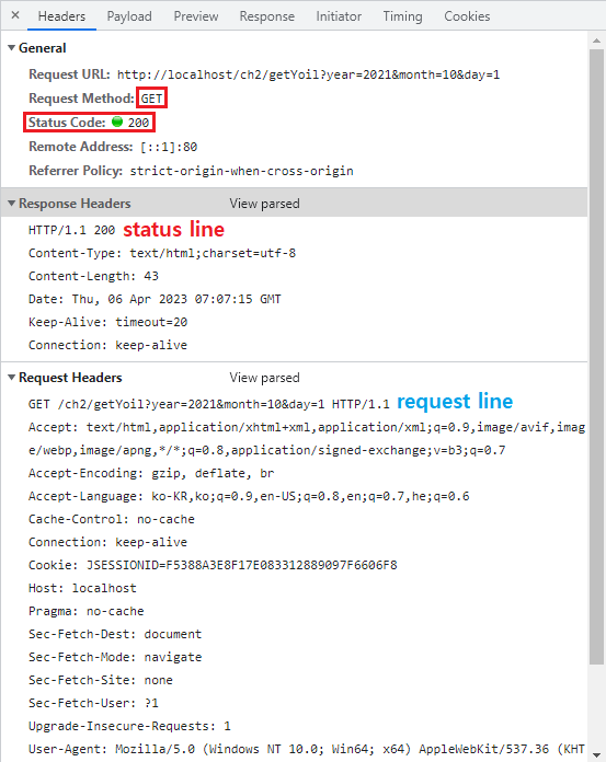 General에는 요청과 응답의 공통헤더 부분이고 Request Method는 GET, Status Cod는 200으로 요청이 성공했다. Response Headers는 응답 헤더로 맨 첫 줄에는 status line, Request Headers는 요청 헤더로 request line이 맨 첫 줄에 적혀 있다.(보이지 않으면 View source를 클릭하자.)