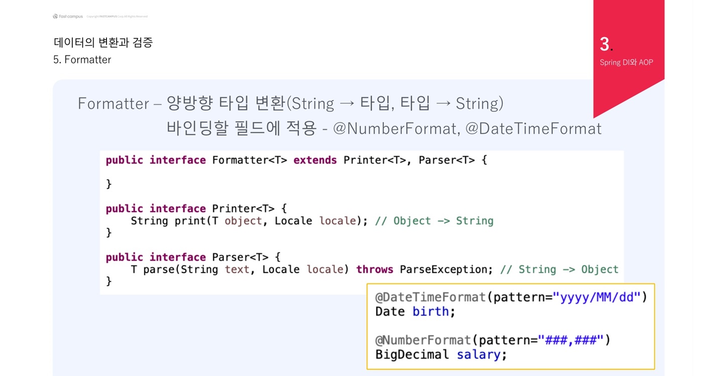 Formatter는 양방향이므로 PropertyEditor와 비슷하다. Formatter는 interface이고 부모 Printer, Parser를 상속받는다. Print는 Object -> String으로, Parse는 String->Object로 변환해서 양방향이다. @NumberFormat은 Object가 숫자 타입이고 @DateTimeFormat은 Object가 날짜 타입이다.