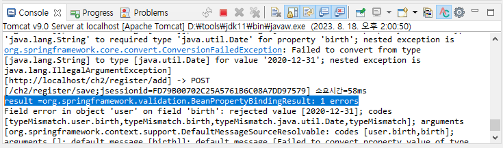 에러가 안뜨는거 뿐이지 발생하긴한다. 이 결과가 BindingResul에 전달되는 것이다. Field error in object 'user' on field 'birth': rejected value [2020-12-31]에서 "2020-12-31"이 필드에서 거절당했다는 내용이 출력된다. 거절 이유는 typeMismatch이다.