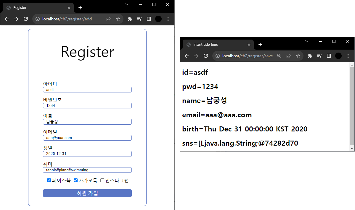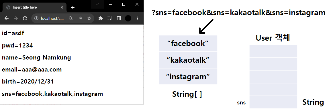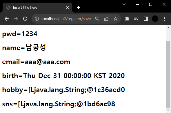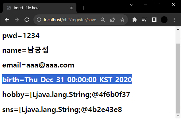Query String은 String 배열이고 sns는 String으로 binding된다. String 배열은 원래 String으로 binding되지 않는다. spring이 이 작업을 자동으로 해준다. 왼쪽 결과를 보면 콤마를 구분자로 String 변환했다. 날짜는 타입이 String으로 되어 있는데 이를 Date로 바꾸면 어떻게 될까?