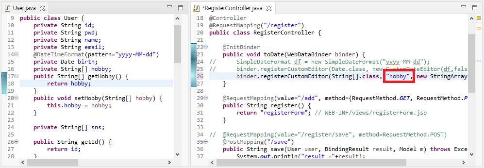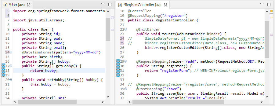 RegisterController에 있는 것을 주석처리 하고 User에 직접 @DateTimeFormat 어노테이션을 사용한다.