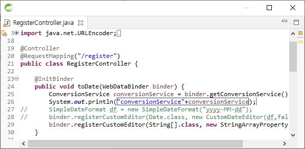 sns는 'sns=카카오톡&sns=인스타그램'으로 요청을 받아 String이면 "카카오, 인스타그램" String 배열이면 ["카카오", 인스타그램"]으로 spring이 알아서 변환을 한다. 하지만 생일은 String "2021/12/31"으로 요청받으면 birth의 Date 타입으로 형변환은 spring이 알아서 변환하지 않는다. 그냥 타입을 변환할 때 에러가 발생해 에러가 어떤식으로 나타나는지 보고 Date 타입으로 형변환을 위해 변환기 registerCustomEditor를 사용해서 변환 메서드를 만든다.