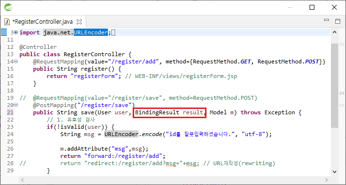 RegisterController은 회원가입으로 registerForm에서 넘어온 데이터를 받아서 User 객체에 담는다. 따라서 save( User user)로 User 매개 변수가 있어야한다. Binding 하기 위해서는 save( User user, Bindingresult result )로 Bindingresult 타입의 매개 변수를 선언해야 Bindingresult에 저장한 데이터와 에러를 사용할 수 있다.