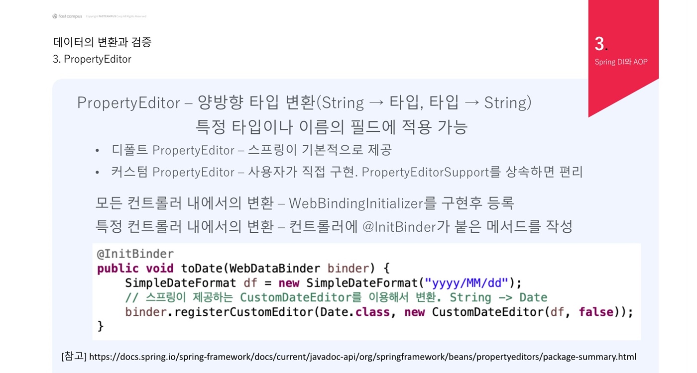 디폴트 PropertyEditor는 스프링이 기본적으로 제공하고 커스텀 PropertyEditor를 사용자가 직접 만들 수 있다. PropertyEditorSupport를 상속받아 overriding하면 편하다. @InitBinder를 이용해서 특정 컨트롤 내에서의 변환만 할 수 있고, WebBindingInitializer를 사용해서 모든 컨트롤러에서 변환하게 할 수 있다.