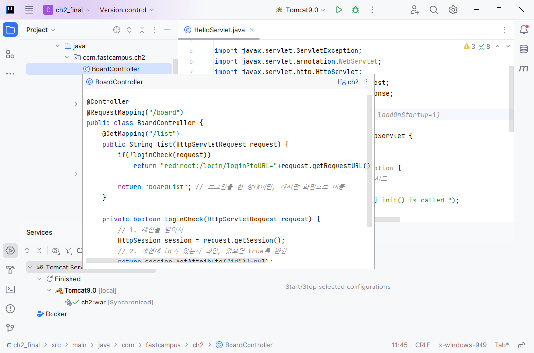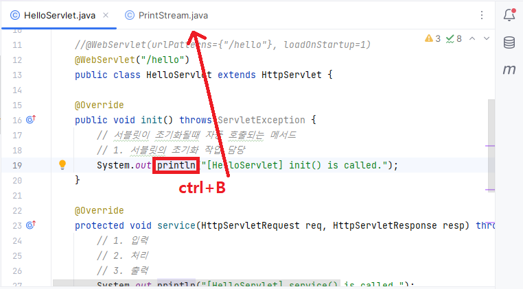 ctrl+B를 입력하면 해당 메서드가 정의되어 있는 곳으로 이동한다.