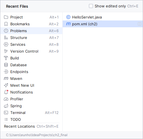 ctrl+E는 최근 수정한 Recent File과 Location을 보여준다. 검색도 가능하다.