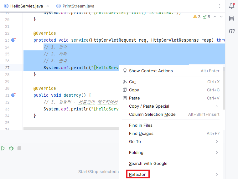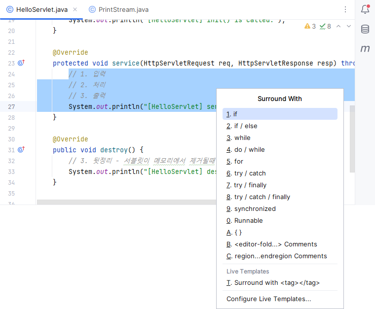 ctrl+alt+T로 해당 문장을 block으로 감쌀 수 있다.