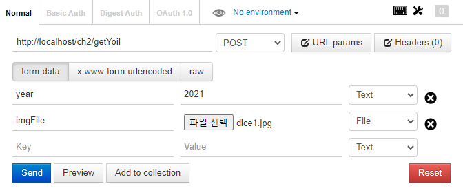 Preview를 누르면 요청 메시지를 간략히 볼 수 있다. 바디에는 우리가 입력한 text data인 year=2021과 binary data인 dice1.jpg가 있다. 이 전체가 POST 요청 메시지이고 text, binary data 둘 다 있어 boundary 경계 문자열을 둬서 구분한다.