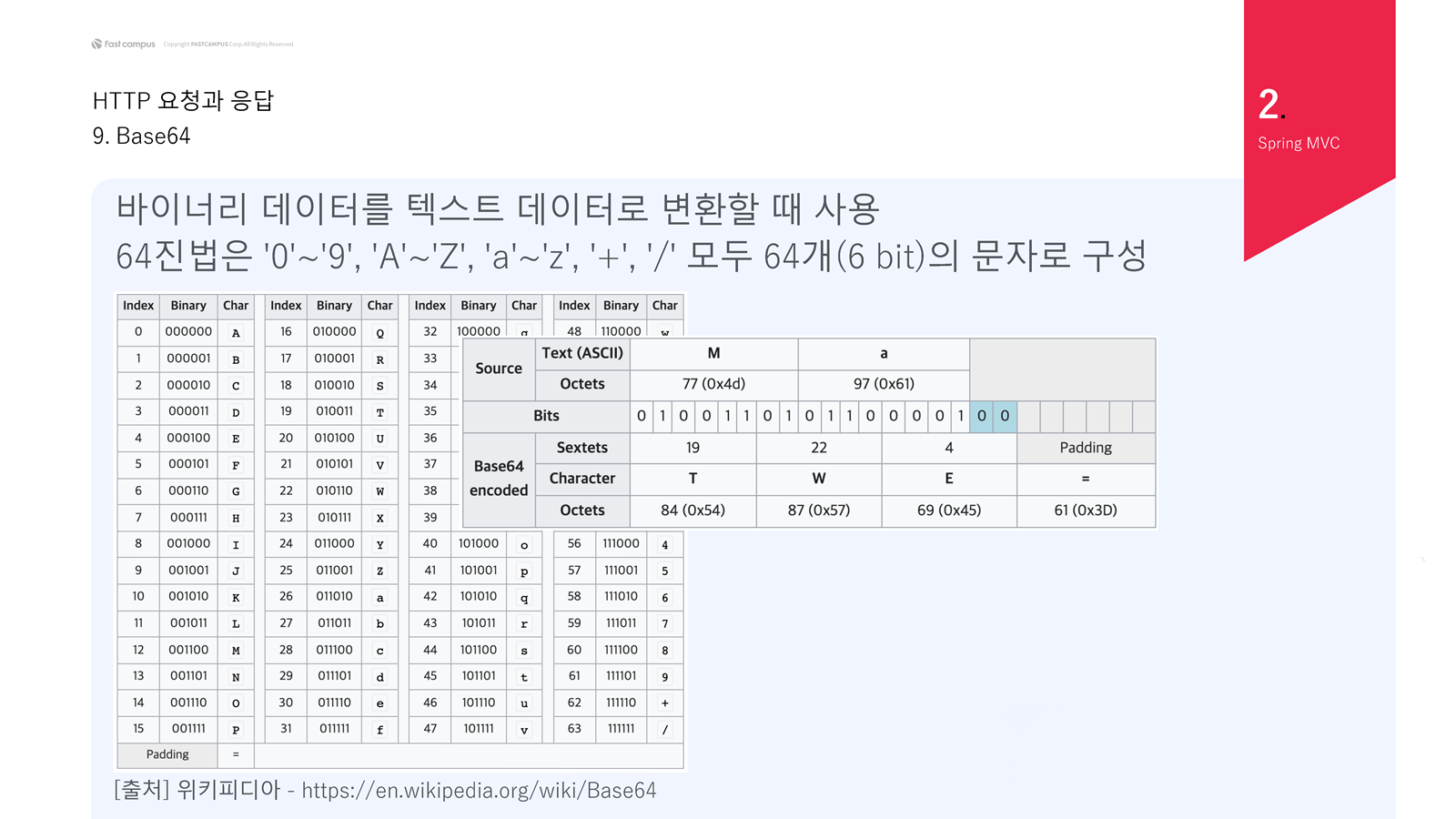 Base64를 왜 사용할까? binary text를 text data로 변환할 때 사용한다. ASCII는 128개 = 2^7, 7bit로 1bit가 더 많은 이유는 특수문자와 출력하지 못하는 글자를 포함한다. ASCII text로 변환하게 되면 개행문자가 OS마다 달라 안전하지 못하고 잘 못 출력될 가능성이 있다. 따라서 ASCII에서 사용할 수 없는 문자를 제외하고 출력할 수 있는 문자만 모은 것이 Base64이다. ASCII만 아니라 모든 인코딩은 적어도 6bit는 갖고 있다. 6bit 문자는 모든 인코딩에서 공통이다. Base64로 변환을 하면 서로 다른 OS를 가진 PC끼리 data를 주고받는데 문제가 없다.
