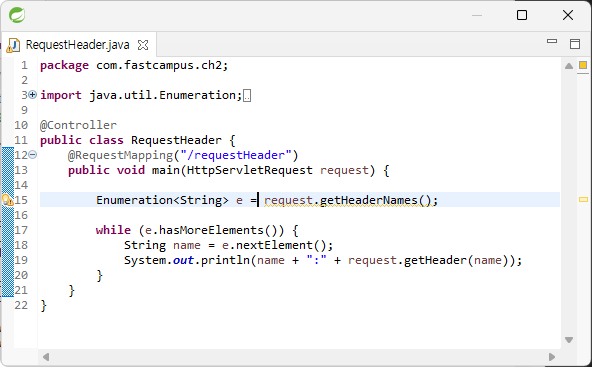 RequestHeader는 요청 메시지의 헤더 정보를 전부 출력해 주는 프로그램이다. getHeaderNames 메서드가 Enumeration에 반환되어서 while문에 헤더를 하나 하나씩 찍은 것이다.