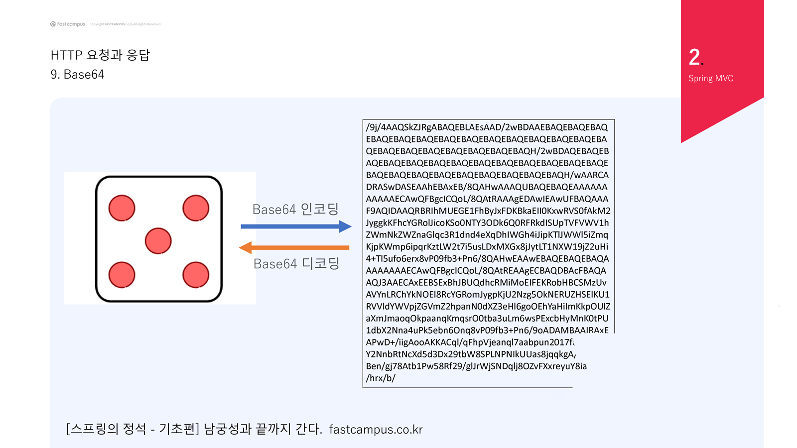 binary data를 text기반인 HTTP protocol에 보내는 방법이 2가지가 있다. MIME 타입을 쓰고 binary 파일 그대로 넘기든가 Base64를 이용해서 text data로 보낸다. 단점은 용량이 커진다.
