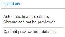 postman의 Limitations 한계가 나오는데 크롬에서 자동으로 추가한 헤더는 preview에서 볼 수 없다는 말이다. 또 form-data의 내용을 볼 수 없다.