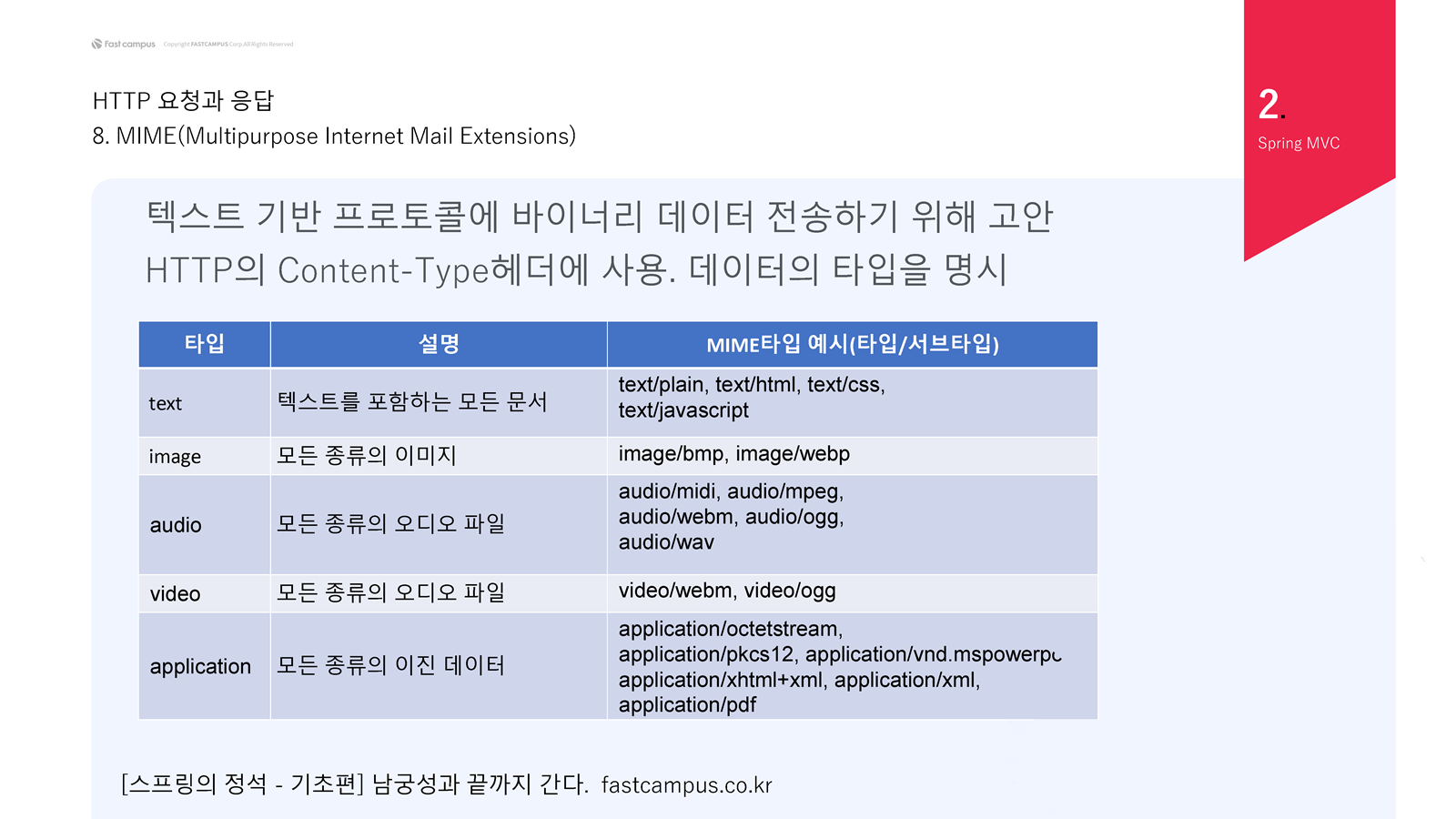 아무튼 HTTP Protocol에서도 binary 파일 전송이 가능하다. binary인지 text인지 구분하기 위해서 MIME 타입을 적는 것이다. HTTP의 Content-Type헤더에 사용한다.