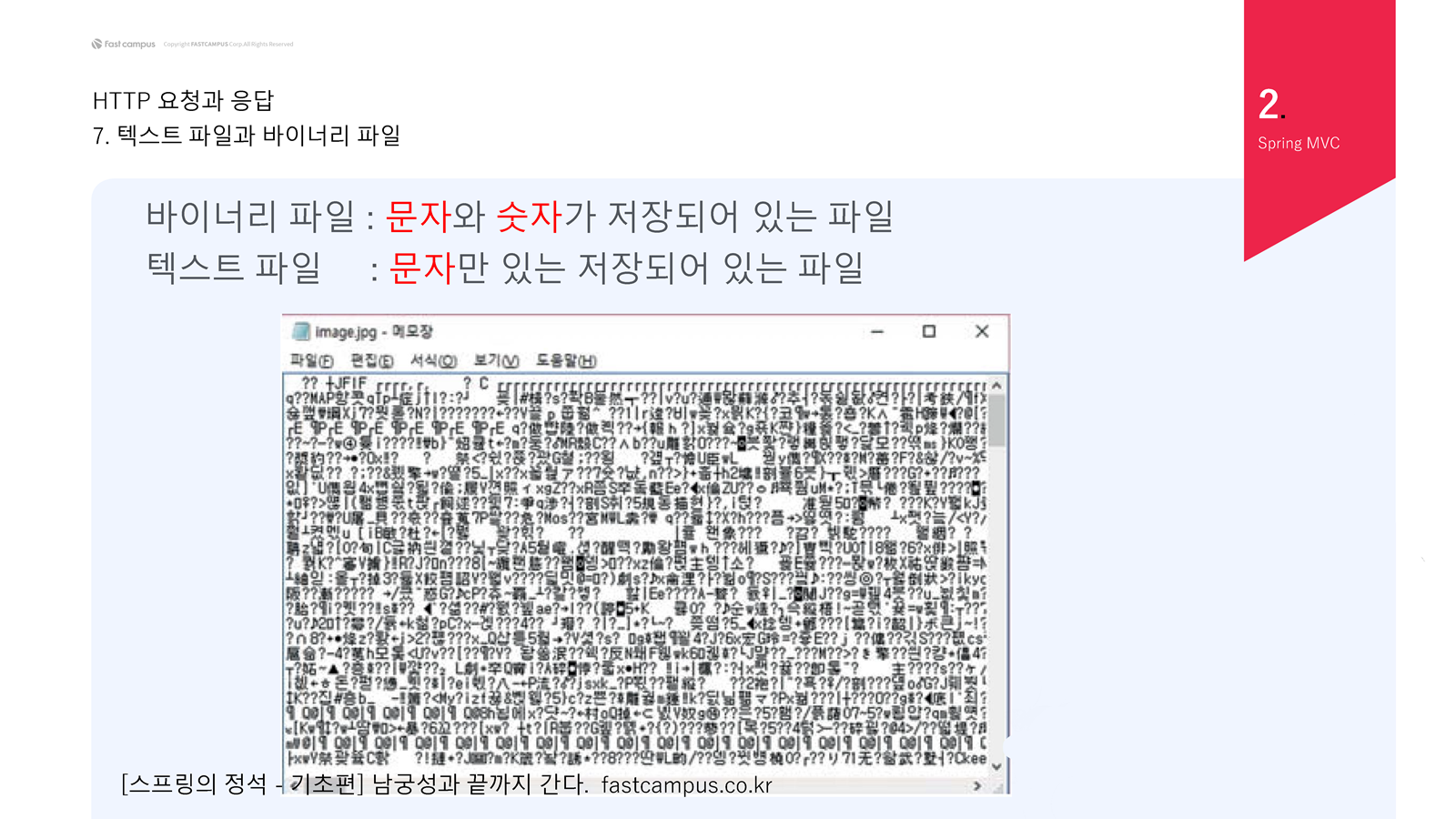 data는 크게 문자, 숫자로 되어 있다. 위 그림은 image.jpg를 메모장으로 읽은 것이다. 메모장은 text editor이므로 image.jpg를 text로 인식해서 보여준다. 파일이 text 파일인지 binary 파일인지 구분하는 방법은 메모장으로 열었을 때 읽을 수 있으면 text 파일이고 못 읽으면 binary 파일이다. 위 그림에서 문자 외에 깨진 것은 숫자라 보면 된다.