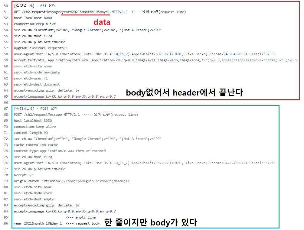 GET요청은 body가 없어 heaer에서 끝난다. POST 요청은 한 줄이지만 body가 있다.