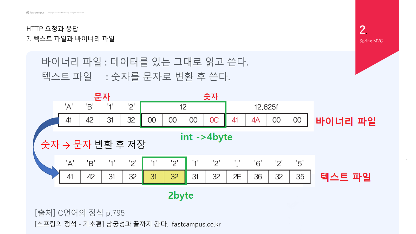 text 파일은 숫자를 문자로 바꿔 숫자 12를 저장할 때 문자 "1" "2"로 바꿔서 저장한다. 숫자는 int형 4byte인데 2byte로 사이즈가 줄었다(Encoding이 UTF-8 가정하에) . float형인 12.625f는 "1" "2" "." "6" "2" "5" 문자 6개로 저장하기 때문에 4byte에서 6byte로 사이즈가 오히려 커졌다. 숫자를 문자로 바꿀 때는 크기에 장단점이 있다.