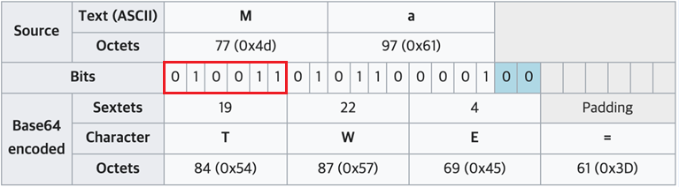 Base64는 Data를 표현할 때 64개를 이용해서 표현한다. 64 = 2^6으로 6bit이다. Ma를 2진수로 변환하고 6bit 단위로 자르는 것이 Base64로 변환한 것이다. 뒤에 자리가 남으면 '0'으로 채우고, 6자리가 남으면 Padding 문자열을 넣는다. 자릿수를 맞추기 위해서 넣는다.