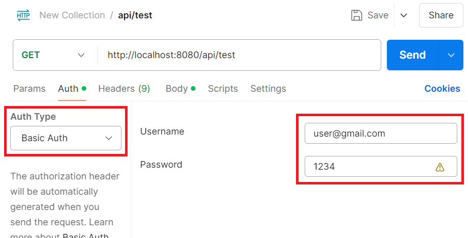 그 다음 Postman으로 들어가서 Auth -> Auth Type을 Basic Auth로 설정하고 회원 가입에 사용했던 id와 비밀번호를 넣는다.