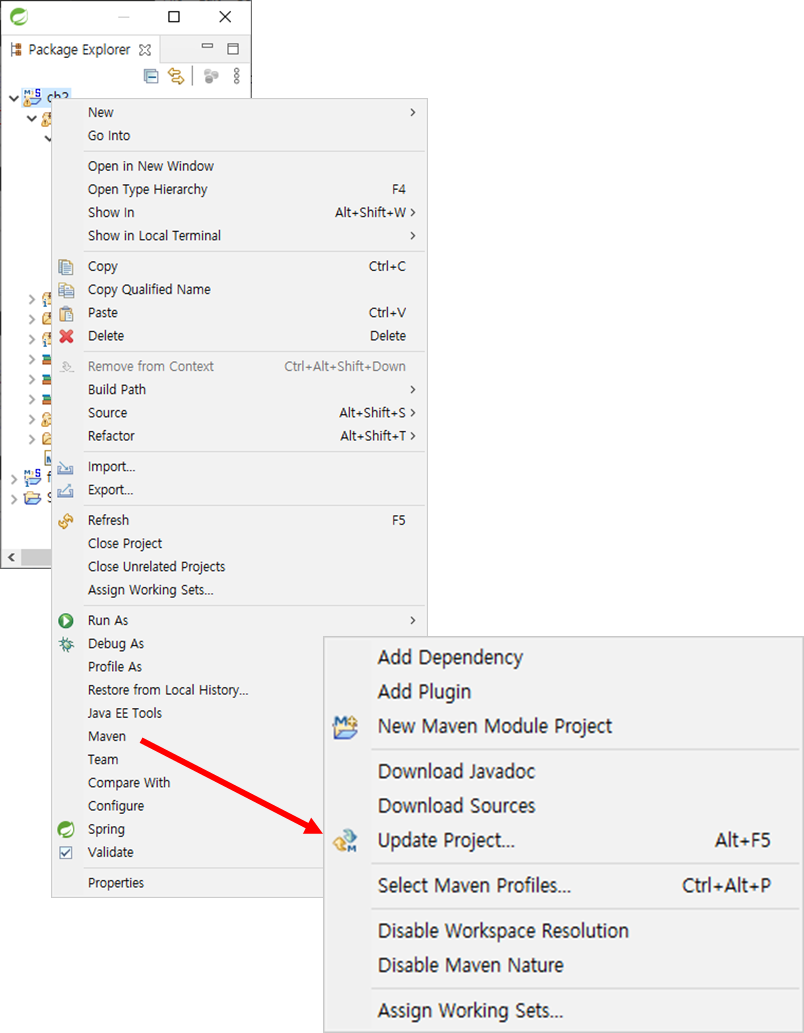 변경 사항을 적용하기 위해 Maven항목에서 Update Project를 해야한다. 프로젝트를 Maven을 이용해서 관리하고 pom.xml파일이 maven 설정 파일이므로 변경한 것을 적용하기 위해서는 업데이트를 해야한다.