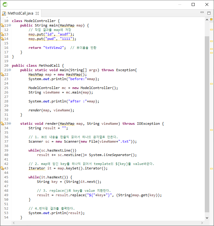 HashMap을 처음 생성했을 때는 data가 없기 때문에 공백이 나오게 되고 ModelController 메서드에서 map에 data가 채워진다. 그리고 retrun에 view가 반환되어 render 메서드로 console에 id, pwd가 출력된다.